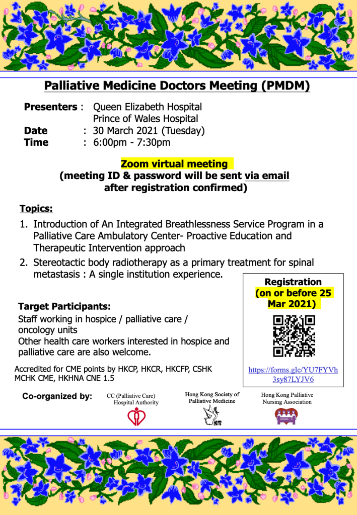 | Topics | 1. Introduction of An Integrated Breathlessness Service Program in a Palliative Care Ambulatory Center- Proactive Education and Therapeutic Intervention approach 2. Stereotactic body radiotherapy as a primary treatment for spinal metastasis : A single institution experience. |