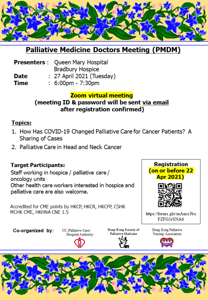 | Topics | 1. How Has COVID-19 Changed Palliative Care for Cancer Patients? A Sharing of Cases 2. Palliative Care in Head and Neck Cancer |