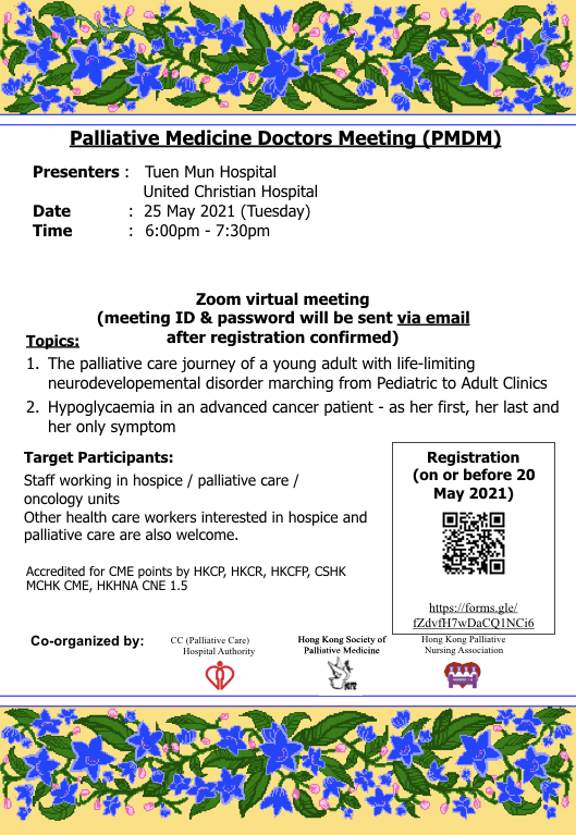 | Topics | 1. The palliative care journey of a young adult with life-limiting neurodevelopmental disorder marching from Pediatric to Adult Clinics 2. Hypoglycemia in an advanced cancer patient – as her first, her last and her only symptom |