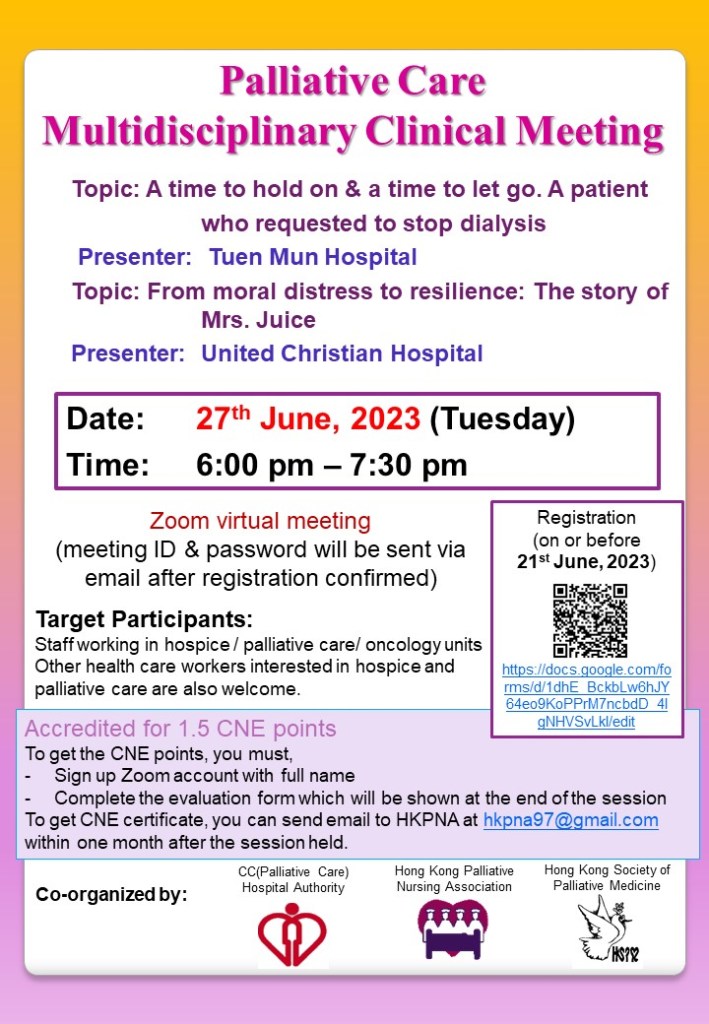 | Topics | 1. A time to hold on & a time to let go. A patient who requested to stop dialysis 2. From moral distress to resilience: The story of Mrs. Juice |