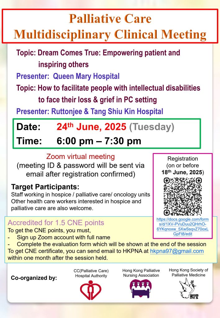 1. Dream Comes True: Empowering patient and inspiring others 2. How to facilitate people with intellectual disabilities to face their loss & grief in PC setting