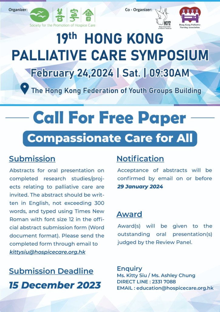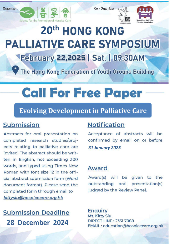 Abstracts for oral presentation on completed research studies/projects relating to palliative care are invited. The abstract should be written in English, not exceeding 300 words, and typed using Times New Roman with font size 12 in the official abstract submission form (Word document format). Please send the completed form through email to kittysiu@hospicecare.org.hk .